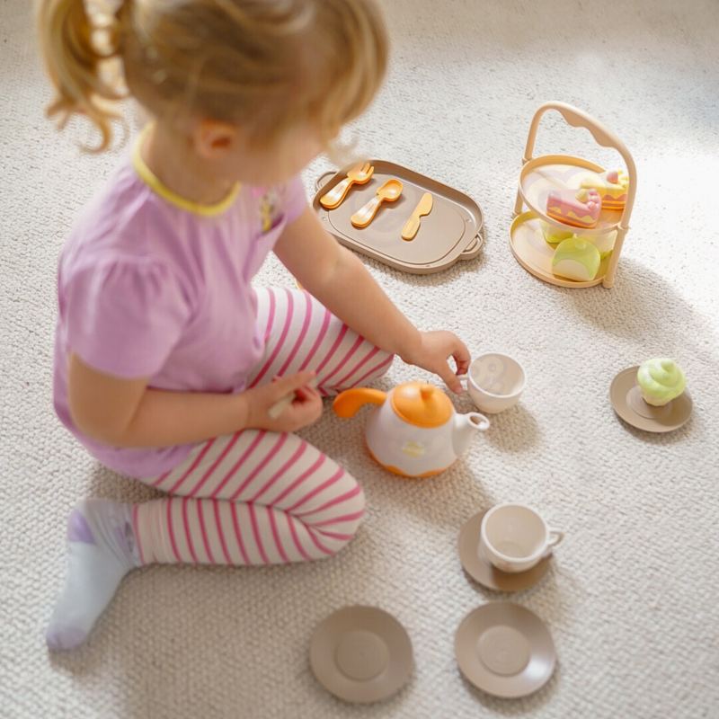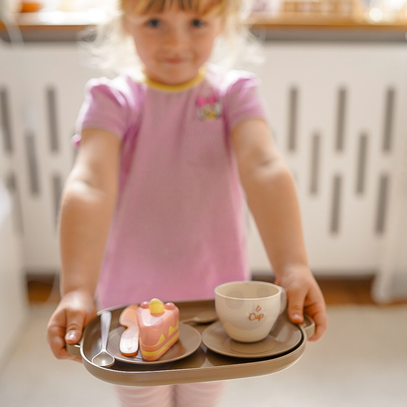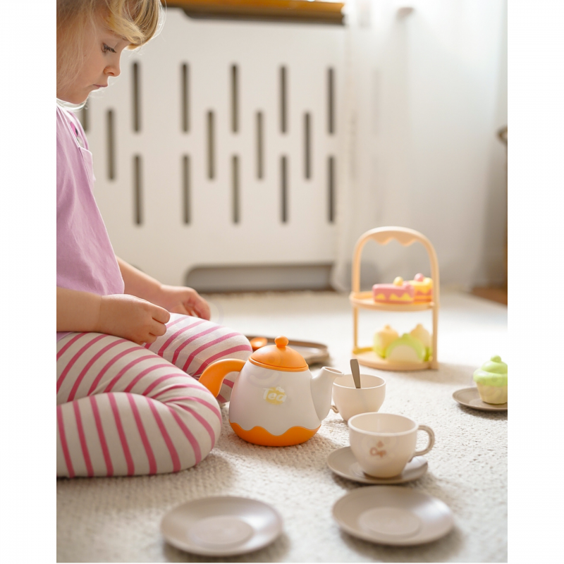 Drewniany zestaw do herbaty i deserów sprawi, że dziecko będzie mogło przyjmować gości i serwować herbatę oraz desery całej rodzinie. Nauczy dobrych manier i umiejętności dzielenia się z innymi podczas zabawy.