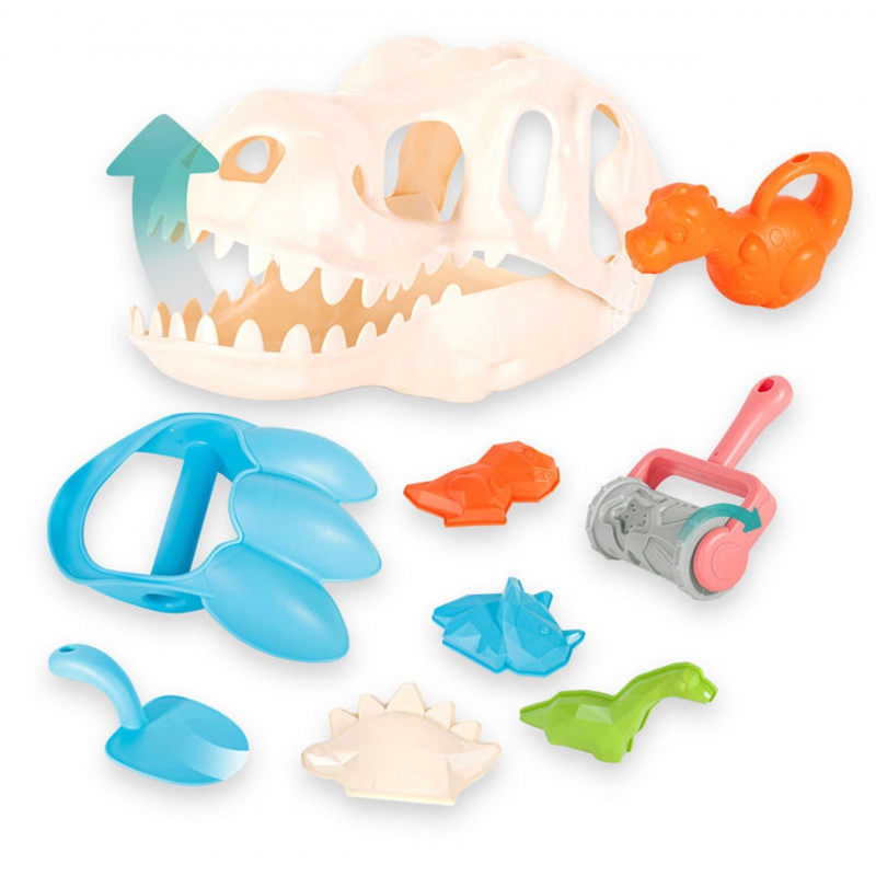 Zestaw do Piasku Dinozaury Wykopalisko od marki WOOPIE to świetny dodatek do piaskownicy, a nawet ogrodu. Zestaw zawiera 9 elementów: czaszkę dinozaura, 4 foremki, łopatkę, pazury do piasku, konewkę oraz walec. Zabawki wykonane są w motywie dinozaurów i mogą być wykorzystane do zabawy w małego archeologa. Gwarancja super zabawy w piaskownicy, na plaży, a nawet w ogrodzie! Produkt przyjazny środowisku!