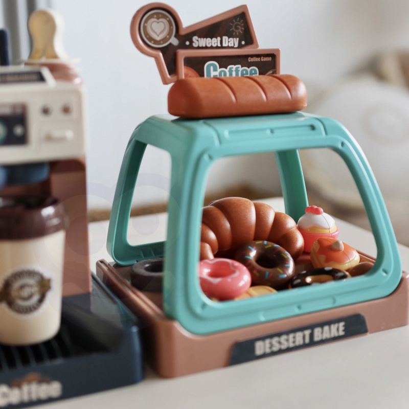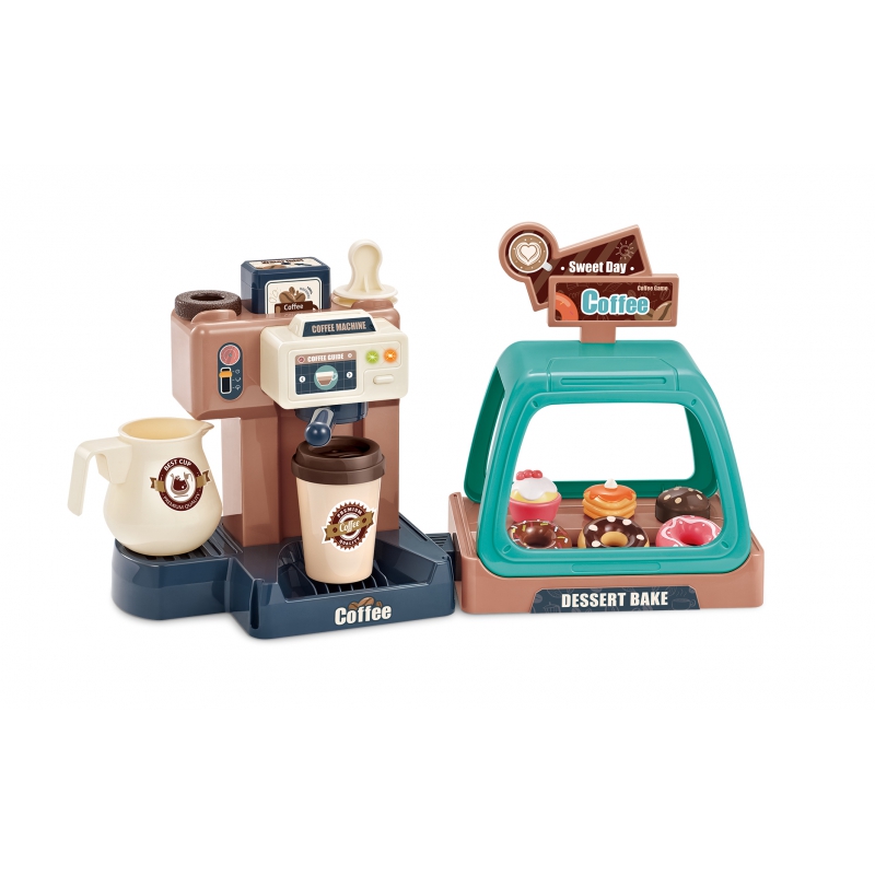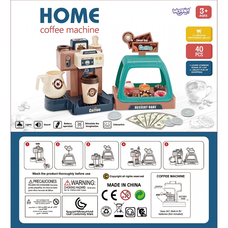Ekspres do kawy od marki WOOPIE to idealny zestaw dla dzieci, które uwielbia wcielać się w rolę dorosłych. Zestaw oprócz ekspresu i wiaty na ciastka zawiera słodkości takie jak donuty czy babeczki w różnych smakach. Ekspres i witrynę można ze sobą dowolnie łączyć lub używać oddzielnie. Ekspres do kawy ma funkcję przepływu wody, wystarczy nalać od góry wodę do pojemnika, zamontować kolbę ekspresu, podstawić kubeczek i kawa gotowa! Ponadto wydaje dźwięki/odgłosy mielenia i parzenia kawy, świeci się wtedy mrugająca czerwona lampka, a gdy kawa będzie gotowa zaświeci się zielone światło i usłyszymy sygnał zakończenia pracy. Po zamontowaniu portu filtra usłyszymy również odgłos nalewania kawy. Zabawka z pewnością zaciekawi każde dziecko. Zabawa w sklep z przyjaciółmi pomoże rozwinąć świadomość i zdolności społeczne.