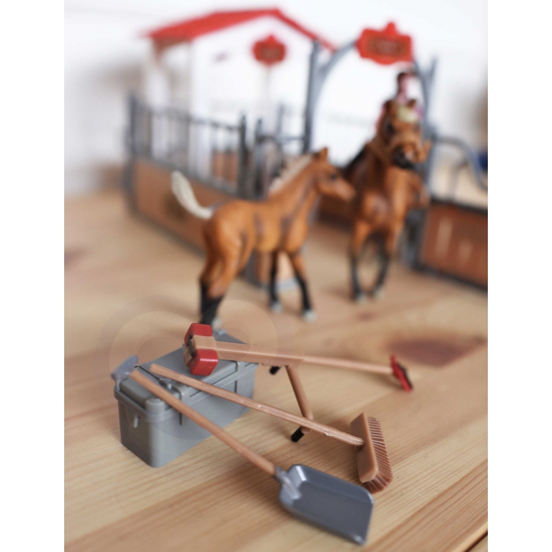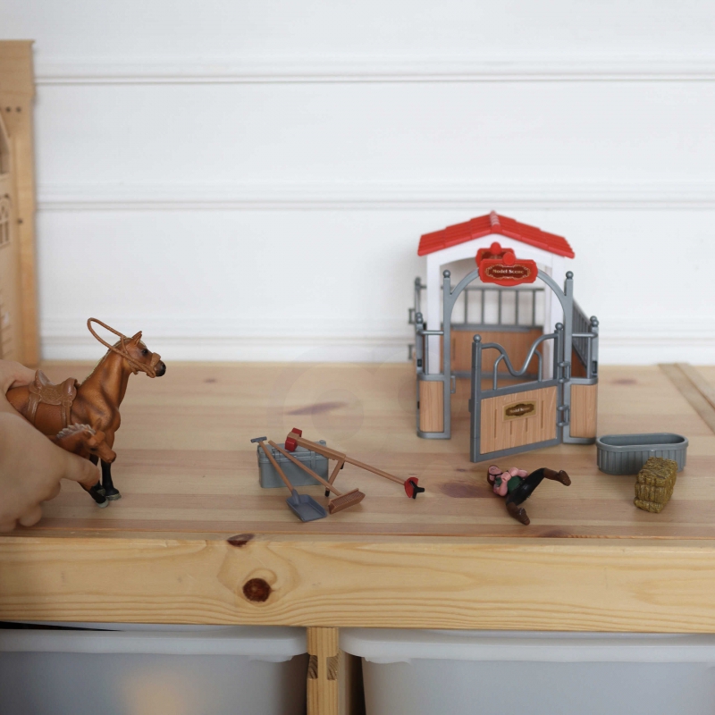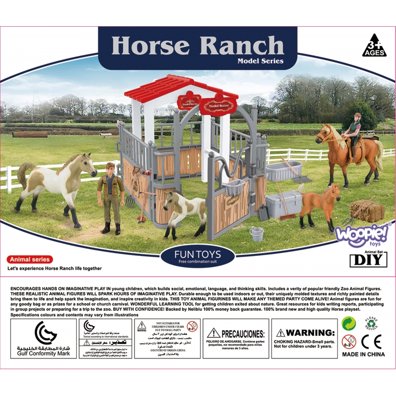 Zestaw Stajnia od marki WOOPIE to idealna zabawka dla miłośnika wiejskiego życia. W zestawie oprócz super stajni znajdują się 2 figurki koni, dżokejka, sianko i różnego rodzaju akcesoria. Stajnia ma klasyczny wygląd i jest doskonale odwzorowane, a same elementy są bardzo trwale wykonane. Dzięki zabawie w stajnie koni maluch poszerzy zakres swojej wyobraźni i kreatywności.