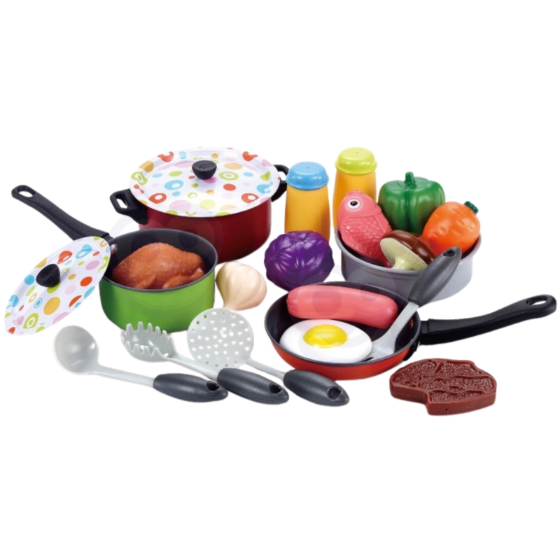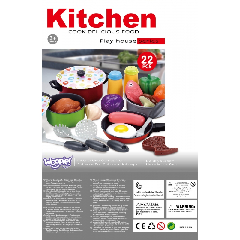 Duży zestaw kucharza marki Woopie to gratka dla każdego małego kucharza. Każdy maluch naśladuje rodziców, a zestaw Woopie pozwoli na posiadanie swoich naczyń i przygotowanie własnych dań. Wszystkie przedmioty zrobione z dbałością o każdy szczegół. Mamy tam garnek i rondelek, które mają swoją pokrywkę, dodatkowo patelnie, miseczkę, artykuły spożywcze oraz przybory kuchenne. Zestaw przeznaczony dla dzieci od 3 roku życia.