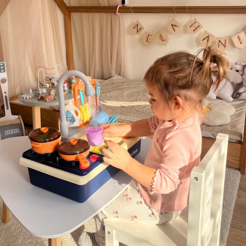 Zlewozmywak Kuchenka 2w1 od marki WOOPIE pozwoli dzieciom gotować i zmywać naczynia tak jak ich rodzice – naśladować od najmłodszych lat! Zabawka jest doskonale odwzorowana, dzięki czemu dziecko ma wrażenie, że wykonuje prawdziwe czynności kuchenne. Posiada ruchome elementy jak kurki od kuchenki oraz kran, z którego leci prawdziwa woda. Wystarczy wlać do misy wodę i zobaczyć jak dziecko się bawi, a po wszystkim wystarczy opróżnić dolną misę. Dodatkowo, zestaw zawiera wiele akcesoriów jak garnki i artykuły spożywcze. Zabawa w gotowanie, zmywanie naczyń i wykonywanie podobnej pracy, pomaga dzieciom nabrać poczucia odpowiedzialności i samodzielności.