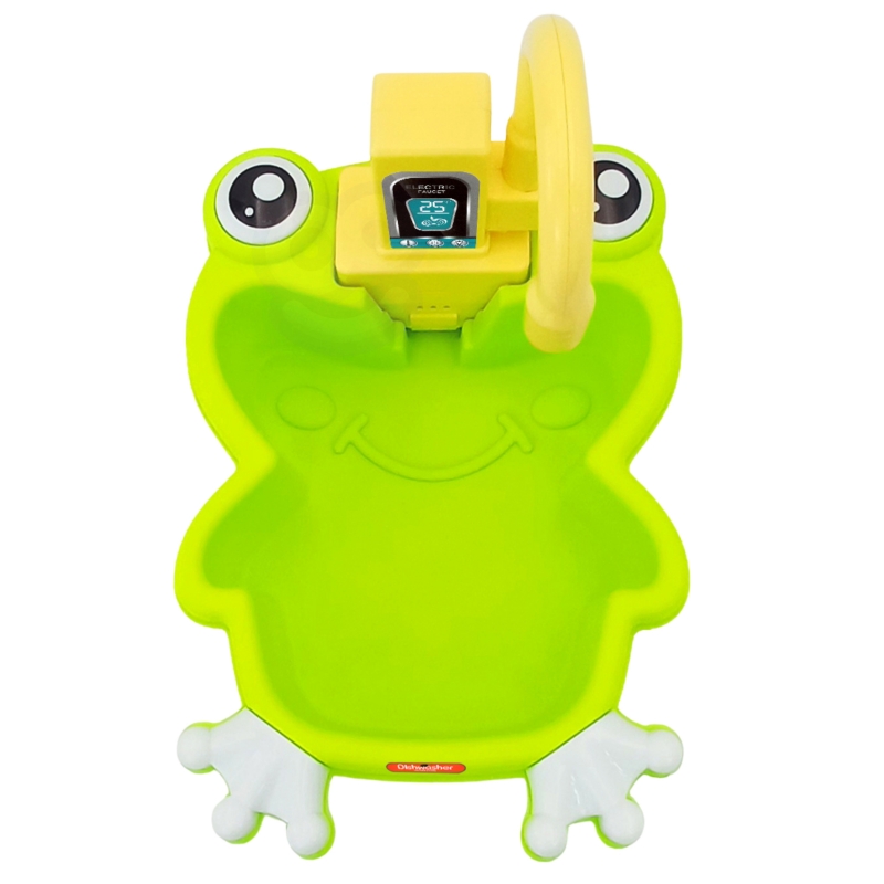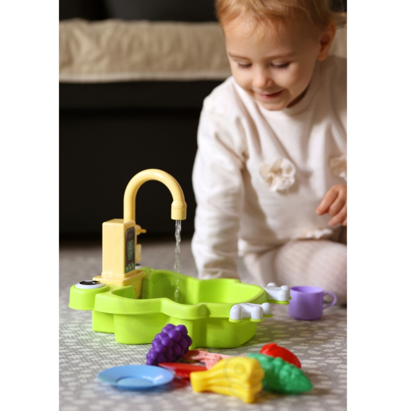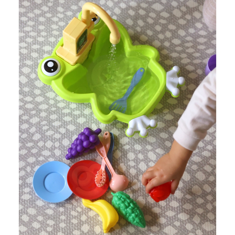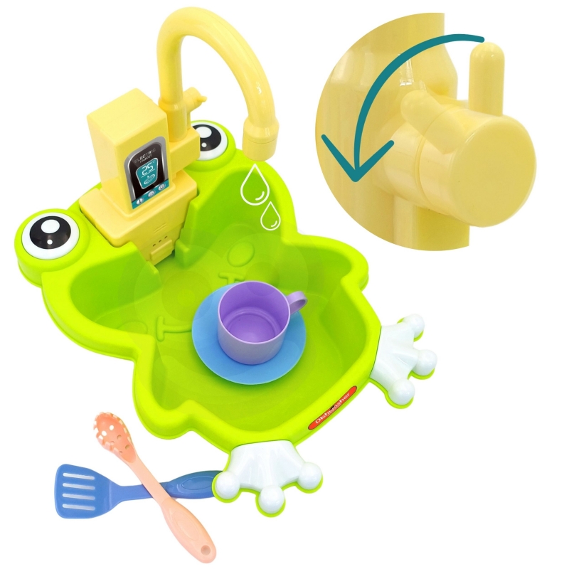 ZLEWOZMYWAK ŻABA od marki WOOPIE pozwoli dzieciom zmywać tak jak ich rodzice – naśladować od najmłodszych lat! Zabawka jest w kształcie żaby, dzięki czemu dziecko jeszcze prościej jest zachęcić do zabawy oraz ma wrażenie, że wykonuje prawdziwe czynności kuchenne. Posiada ruchome elementy jak kurek od kranu, z którego leci prawdziwa woda. Jest to obieg zamknięty – aby woda leciała z kranu najpierw należy ją wlać do zlewozmywaka Wodę lejemy minimum do połowy zlewozmywaka.Umieszczamy baterie i po przekręceniu zaworu woda zaczyna lecieć. Z takim zestawem dziecko może samo opłukać sobie owoce oraz pozmywać naczynia.